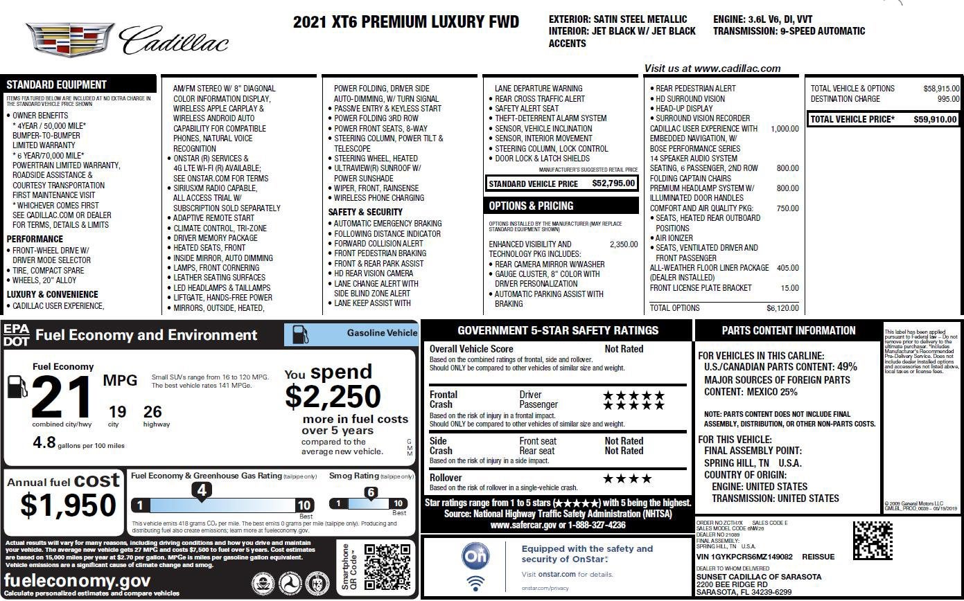 This Satin Steel Metallic 2021 Cadillac XT6 Premium Luxury FWD is well equipped and includes these features and benefits:
